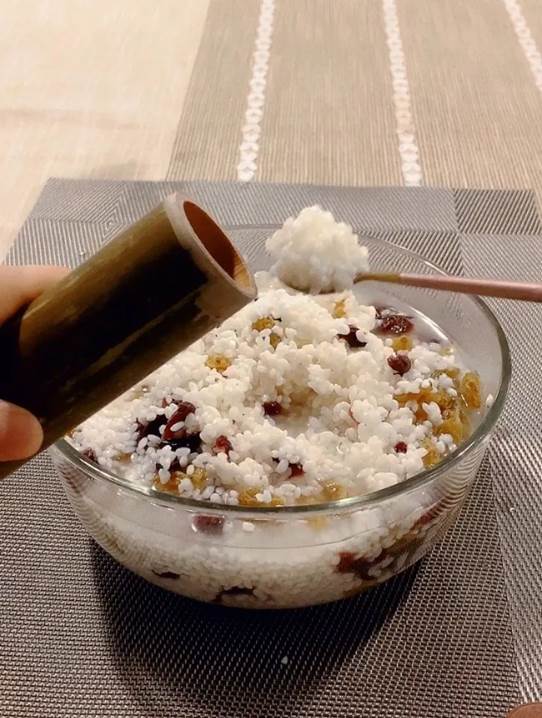 8、先打開一個看看成果。取出的竹筒粽子放入涼水中泡幾分鐘,用竹棍從竹筒底部推出來,不松不散,又軟又糯!推出來后裹上層白糖更好吃~~
