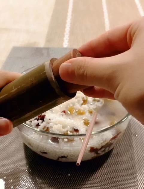 2、邊灌米一邊用筷子捅一捅,為的是米粒之間更緊實。